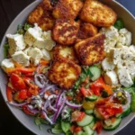 Ajoutez les tranches de Halloumi croustillant sur le dessus et garnissez avec du persil frais. Servez immédiatement et savourez votre Bol de Pouvoir Grec avec Halloumi Croustillant !