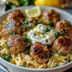 Servez les boulettes chaudes sur un lit d’orzo citronné. Ajoutez une généreuse cuillerée de crème de feta sur le dessus. Ce plat se marie merveilleusement avec une salade verte ou des légumes grillés pour un repas équilibré.