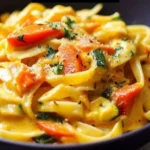La recette de pasta with vegetables, coconut milk & curry, est un plat à la fois sain et réconfortant. Elle combine des pâtes linguine al dente avec une variété de légumes colorés, le tout réhaussé par le goût doux et crémeux du lait de coco et l’épice parfumée de la pâte de curry rouge. Ce plat est non seulement délicieux, mais aussi visuellement attrayant, ce qui en fait un excellent choix pour un dîner en famille ou entre amis.