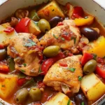 Il y a quelque chose de magiquement réconfortant à l’évocation d’un plat mijoté, et le poulet aux poivrons, pommes de terre et olives en sauce tomate ne fait pas exception. Chaque bouchée évoque le goût du soleil et les repas partagés autour de la table.