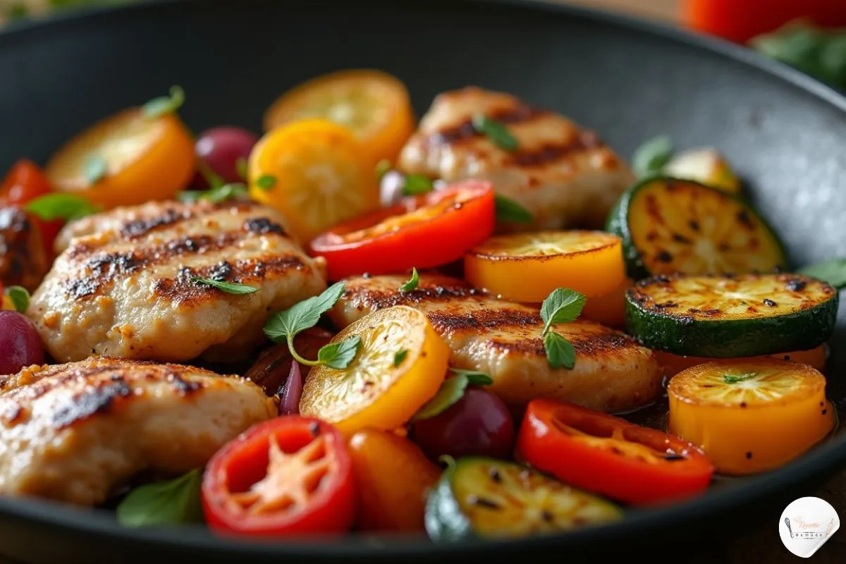 Pour le poulet, faites-le cuire vite à haute température. Utilisez une poêle ou une plancha pour qu’il reste juteux. Pour les légumes, faites-les sauter rapidement pour qu’ils restent croquants. Commencez par cuire le poulet, puis ajoutez les légumes.