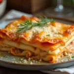 Découpez les lasagnes en portions et disposez-les dans une assiette. Ajoutez des feuilles de persil, du citron ou des pointes d’épinards. Une décoration simple mais raffinée mettra en valeur votre plat.