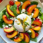 Cette salade est incroyablement simple à préparer, parfaite pour les moments où vous souhaitez quelque chose de léger et joli sans trop d’efforts. Elle a cette capacité unique de réunir différents goûts : la douceur de la burrata, l’acidité des pêches et une touche de piquant grâce à la menthe. Que vous la serviez en entrée ou comme accompagnement, elle impressionne toujours les invités. Avec seulement quelques ingrédients, vous pouvez créer un plat qui fait l’unanimité à chaque fois.