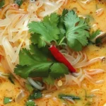 Versez ensuite le bouillon préparé dans la marmite avec l’oignon et le gingembre, et incorporez la crème de coco ainsi que la citronnelle hachée. Assaisonnez avec du sel et du poivre. Laissez cuire doucement pendant environ 5 minutes. Pour servir, répartissez les nouilles dans les bols et recouvrez-les de soupe. N’oubliez pas d’ajouter de la coriandre fraîche et d’y presser une demi-lime pour une touche finale parfaite.